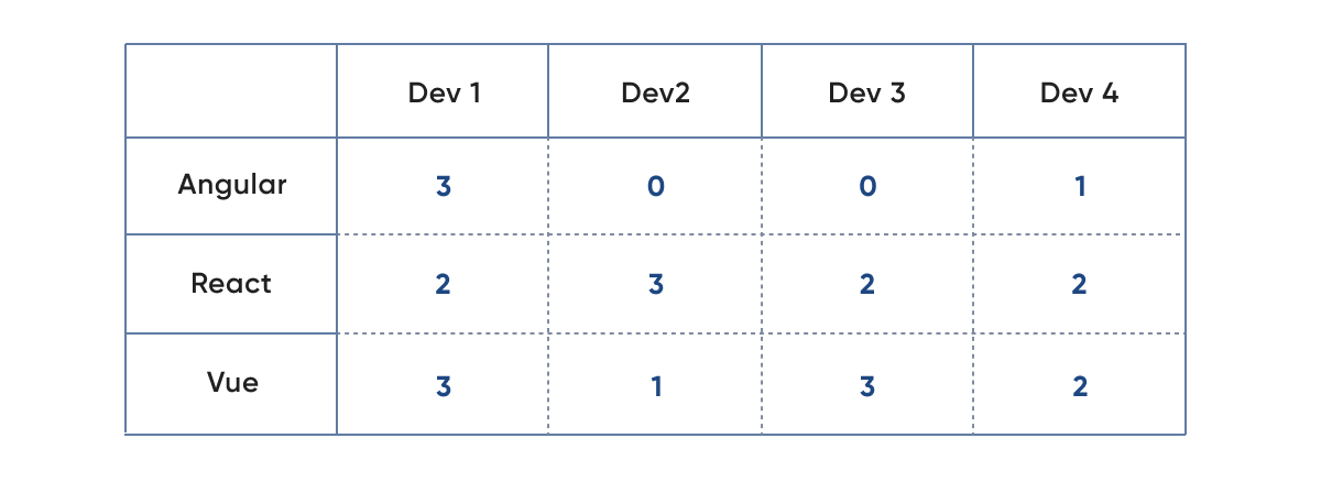 Let's say that 3 skills are important for the project: Angular, React and Vue. You have 4 developers who understand these topics at different levels. The matrix shows that Angular is your bottleneck.